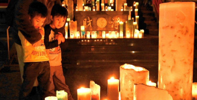 追悼のキャンドル、境内照らす 東日本大震災の月命日に合わ…